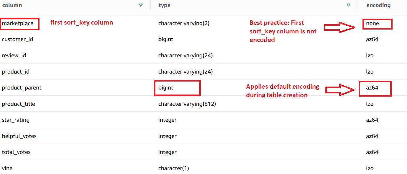 Create the product_reviews table with distribution style auto. We expect users to frequently filter on the columns marketplace and review_date, so we will make those the sort key columns for the table