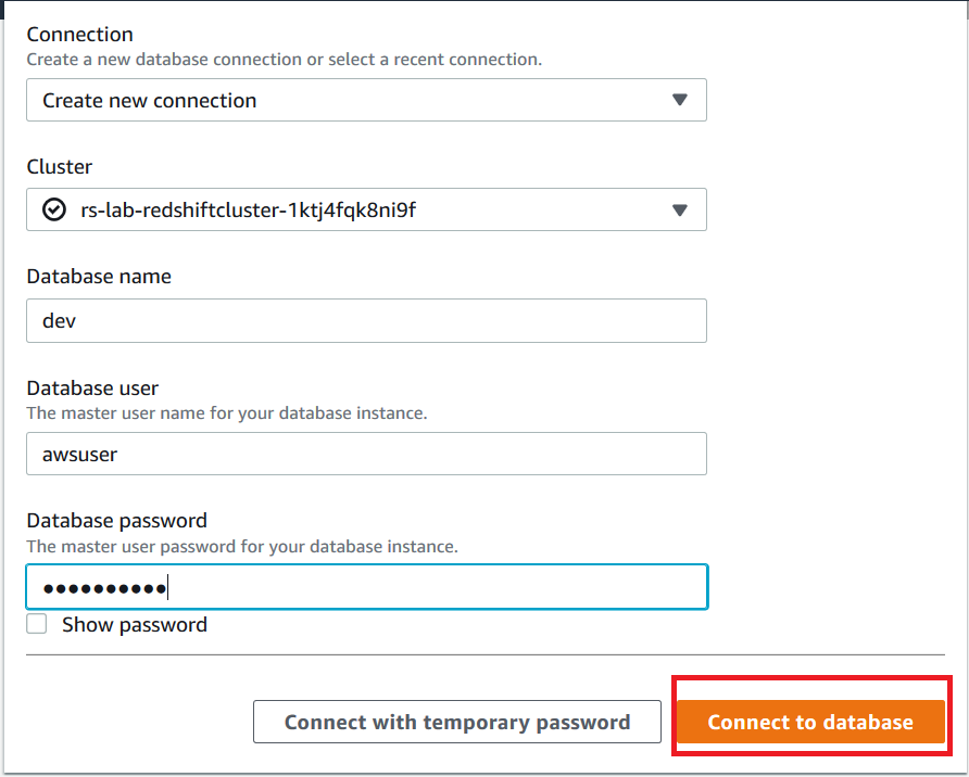 The defaults for the lab are Database name: dev Database user: awsuser Database Password: Awsuser123 |