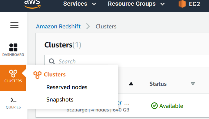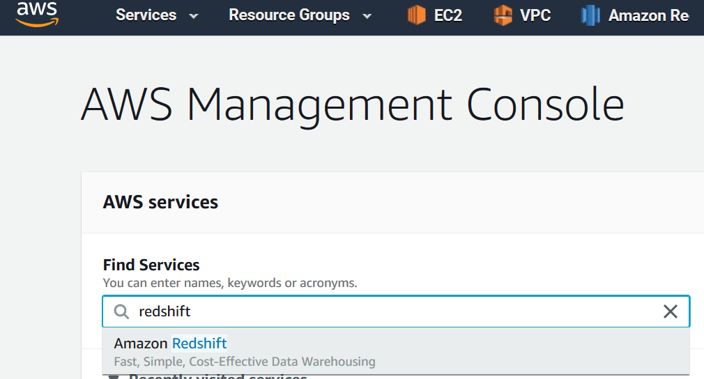 Click Services, type in Redshift and select Amazon Redshift |